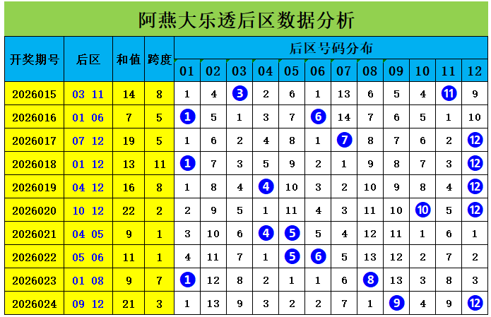 后区上期开出号码09、12,奇偶比为1:1,近十期后区奇偶比为9:11,总体看偶数走势稍热,本期后区要注意奇偶比2:0,五码复式参考:03 04 07 09 11,重点两码推荐:03 07